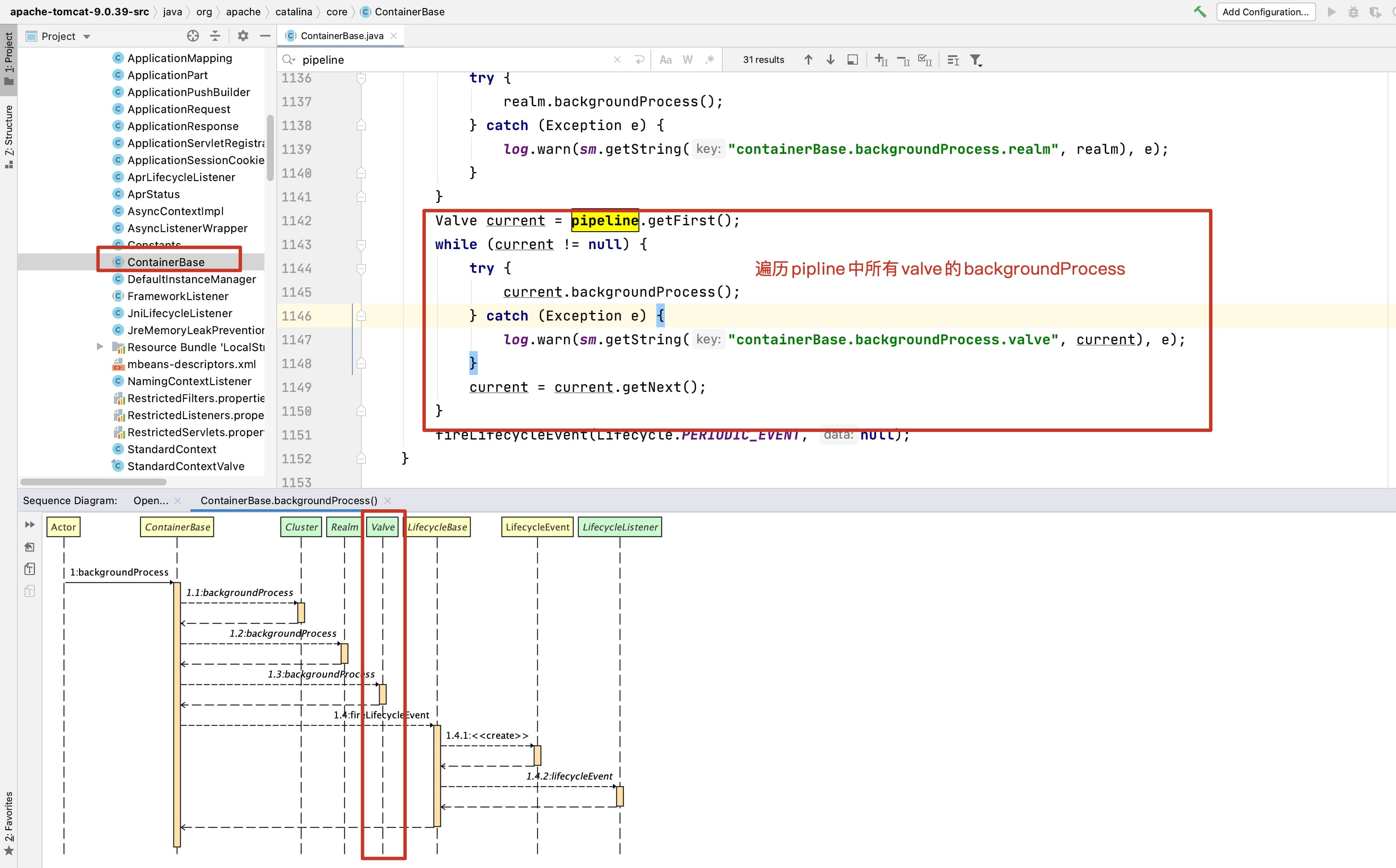 由于Container中都有涉及,实现方法肯定是在抽象的实现类中,所以肯定是在ContainerBase中实现。