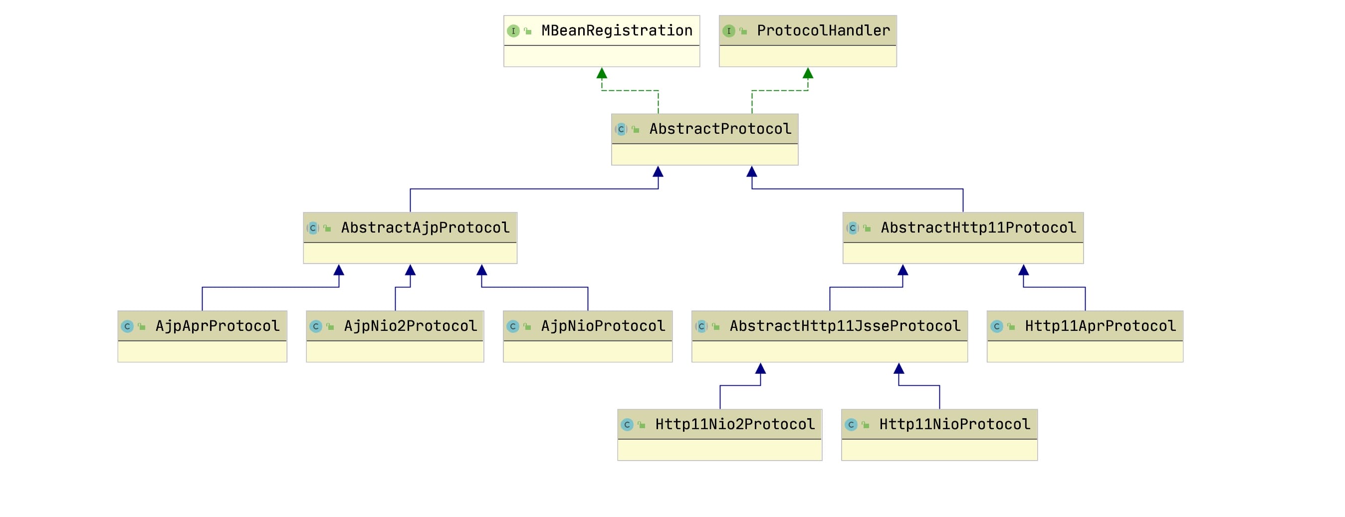 }我们看到上述方法实际通过Protocol初始化了ProtocolHandler, 我们看下它所支持的HTTP1.1,Ajp协议的处理,我们通过它的类层次结构来看协议支持处理类