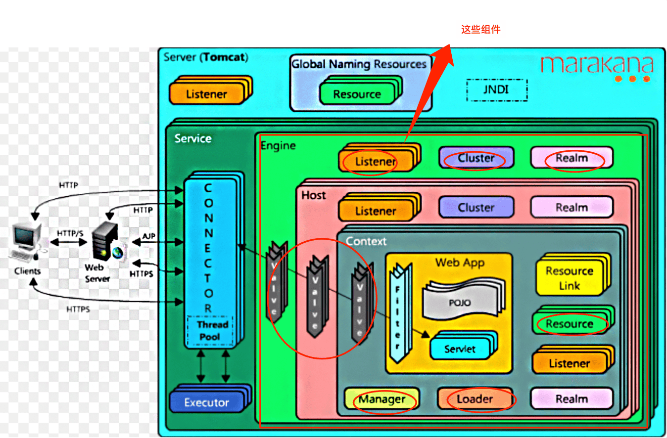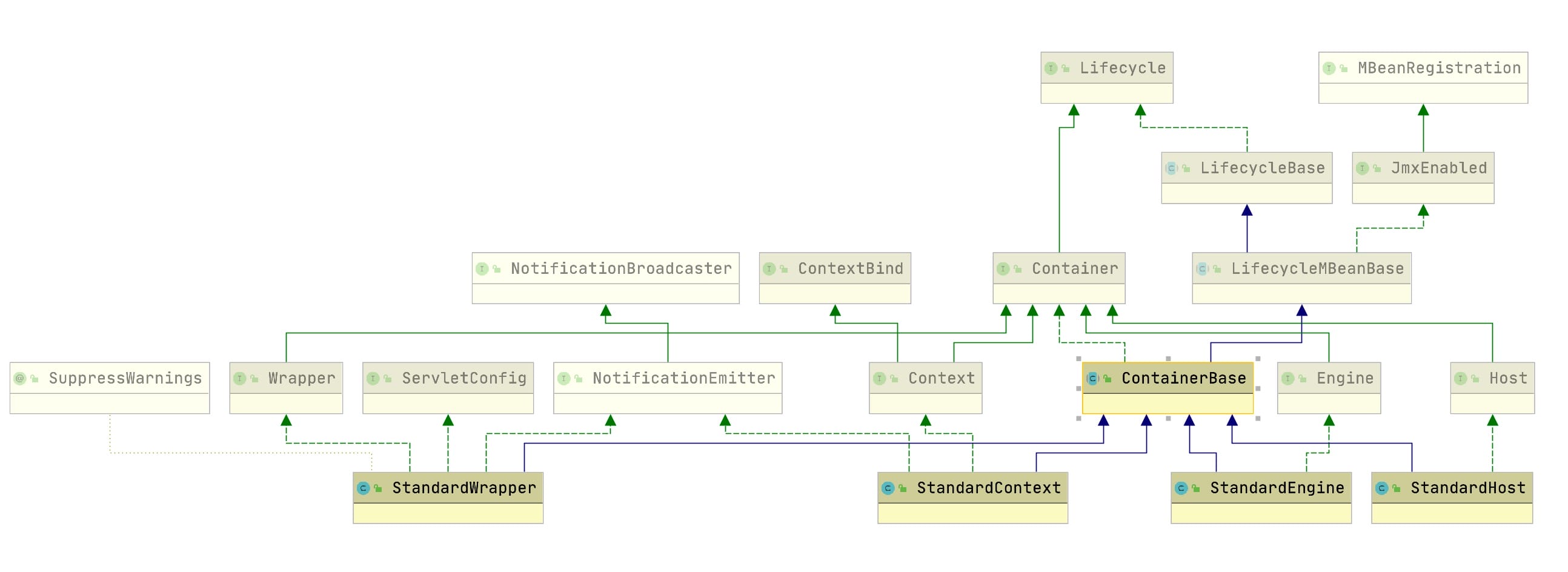 很明显,除了四个组件的嵌套关系,Container中还包含了Realm,Cluster,Listeners, Pipleline等支持组件。