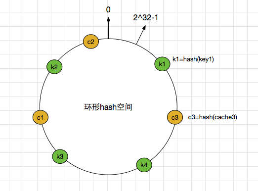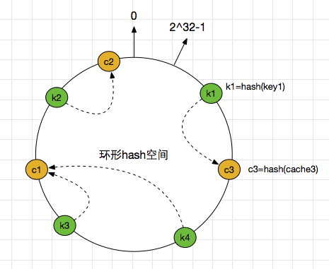 假设我们现在有key1,key2,key3,key4 4个key值,我们通过一定的hash算法,将其对应到上面的环形hash空间中。
