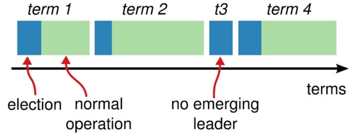 Raft算法将时间分为一个个的任期(term),每一个term的开始都是Leader选举。在成功选举Leader之后,Leader会在整个term内管理整个集群。如果Leader选举失败,该term就会因为没有Leader而结束。