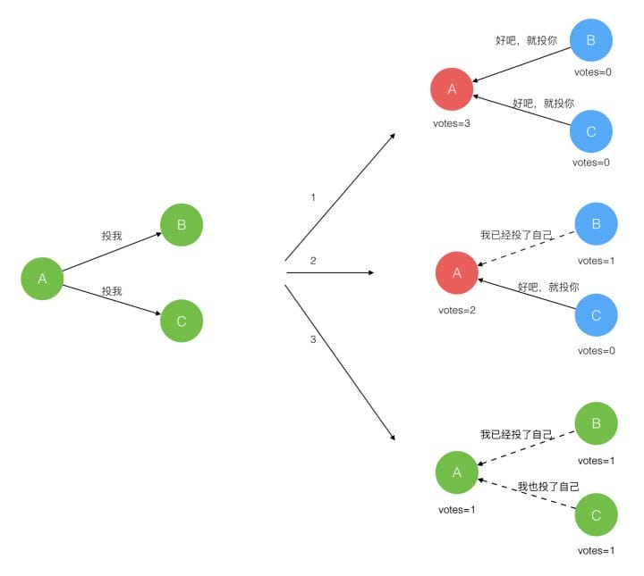 Follower将其当前term加一然后转换为Candidate。它首先给自己投票并且给集群中的其他服务器发送 RequestVote RPC (RPC细节参见八、Raft算法总结)。结果有以下三种情况: