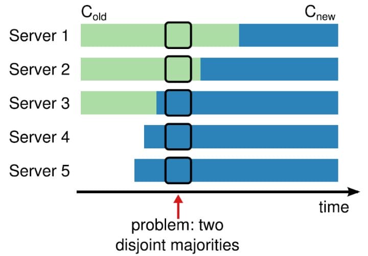 成员变更不能影响服务的可用性,但是成员变更过程的某一时刻,可能出现在Cold和Cnew中同时存在两个不相交的多数派,进而可能选出两个Leader,形成不同的决议,破坏安全性。