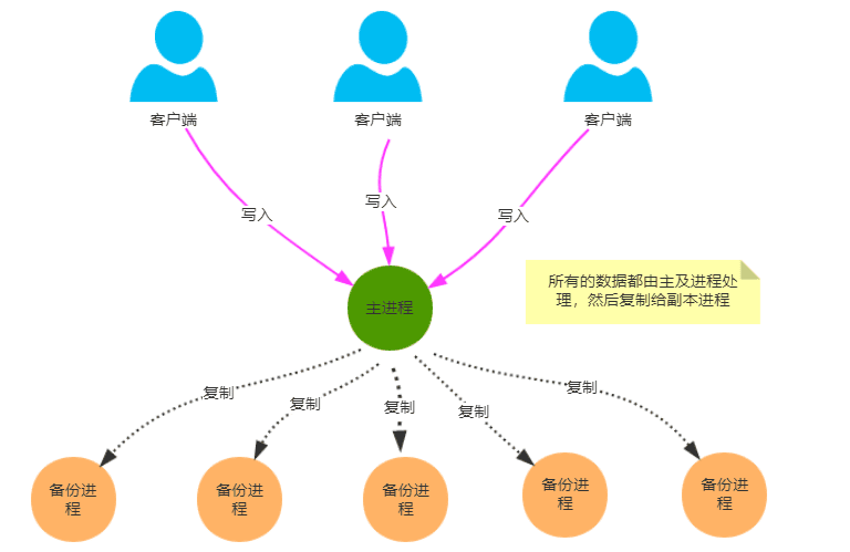 上图显示了 Zookeeper 如何处理集群中的数据。所有客户端写入数据都是写入到 主进程(称为 Leader)中,然后,由 Leader 复制到备份进程(称为 Follower)中。从而保证数据一致性。从设计上看,和 Raft 类似。