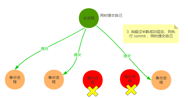 当超过半数成功回应,则执行 commit ,同时提交自己