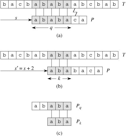 可以用模式 P 与其自身进行比较,以预先计算出这些必要的信息。例如上图(c)中所示,由于 T[s’+1..s’+k] 是文本中已经知道的部分,所以它是字符串 Pq 的一个后缀。