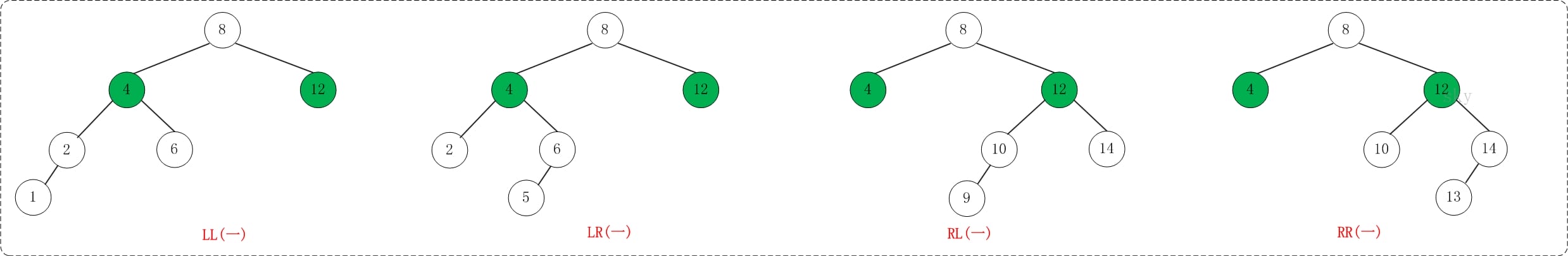 上面的两张图都是为了便于理解,而列举的关于"失去平衡的AVL树"的例子。总的来说,AVL树失去平衡时的情况一定是LL、LR、RL、RR这4种之一,它们都由各自的定义:
