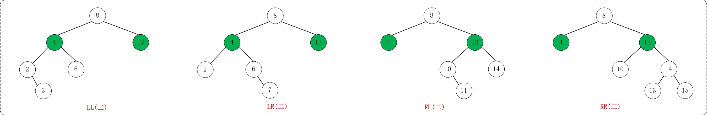 上图中的4棵树都是"失去平衡的AVL树",从左往右的情况依次是: LL、LR、RL、RR。除了上面的情况之外,还有其它的失去平衡的AVL树,如下图: