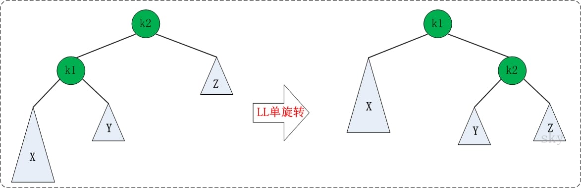图中左边是旋转之前的树,右边是旋转之后的树。从中可以发现,旋转之后的树又变成了AVL树,而且该旋转只需要一次即可完成。 对于LL旋转,你可以这样理解为: LL旋转是围绕"失去平衡的AVL根节点"进行的,也就是节点k2;而且由于是LL情况,即左左情况,就用手抓着"左孩子,即k1"使劲摇。将k1变成根节点,k2变成k1的右子树,"k1的右子树"变成"k2的左子树"。