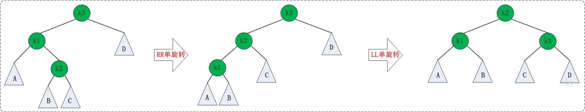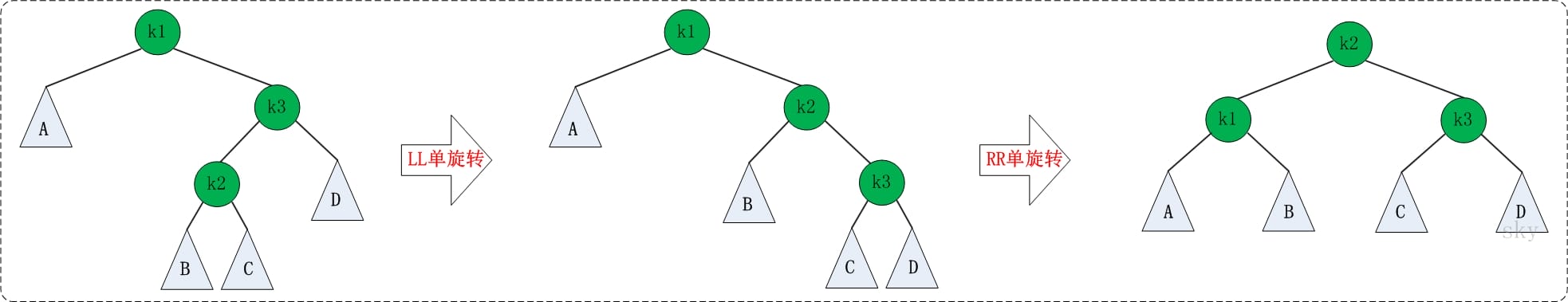 第一次旋转是围绕"k3"进行的"LL旋转",第二次是围绕"k1"进行的"RR旋转"。