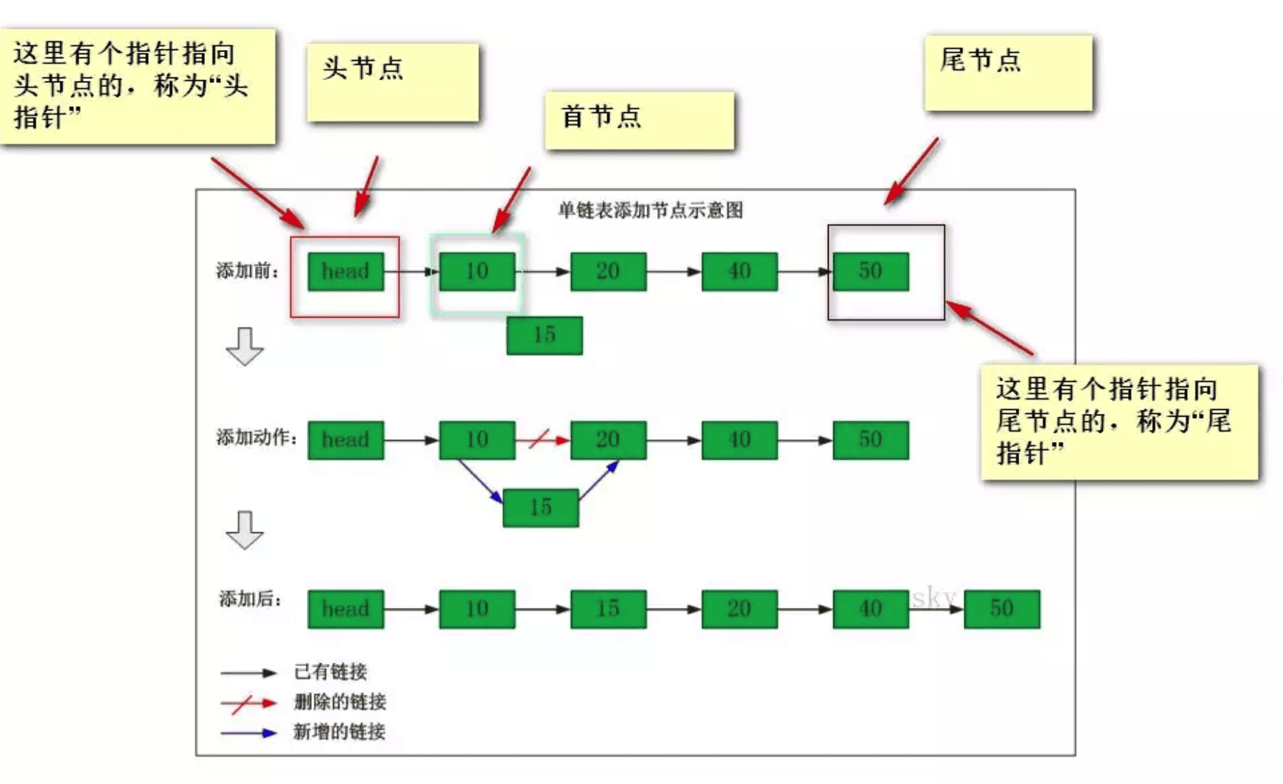 n个节点离散分配,彼此通过指针相连,每个节点只有一个前驱节点,每个节点只有一个后续节点,首节点没有前驱节点,尾节点没有后续节点。确定一个链表我们只需要头指针,通过头指针就可以把整个链表都能推出来。@pdai