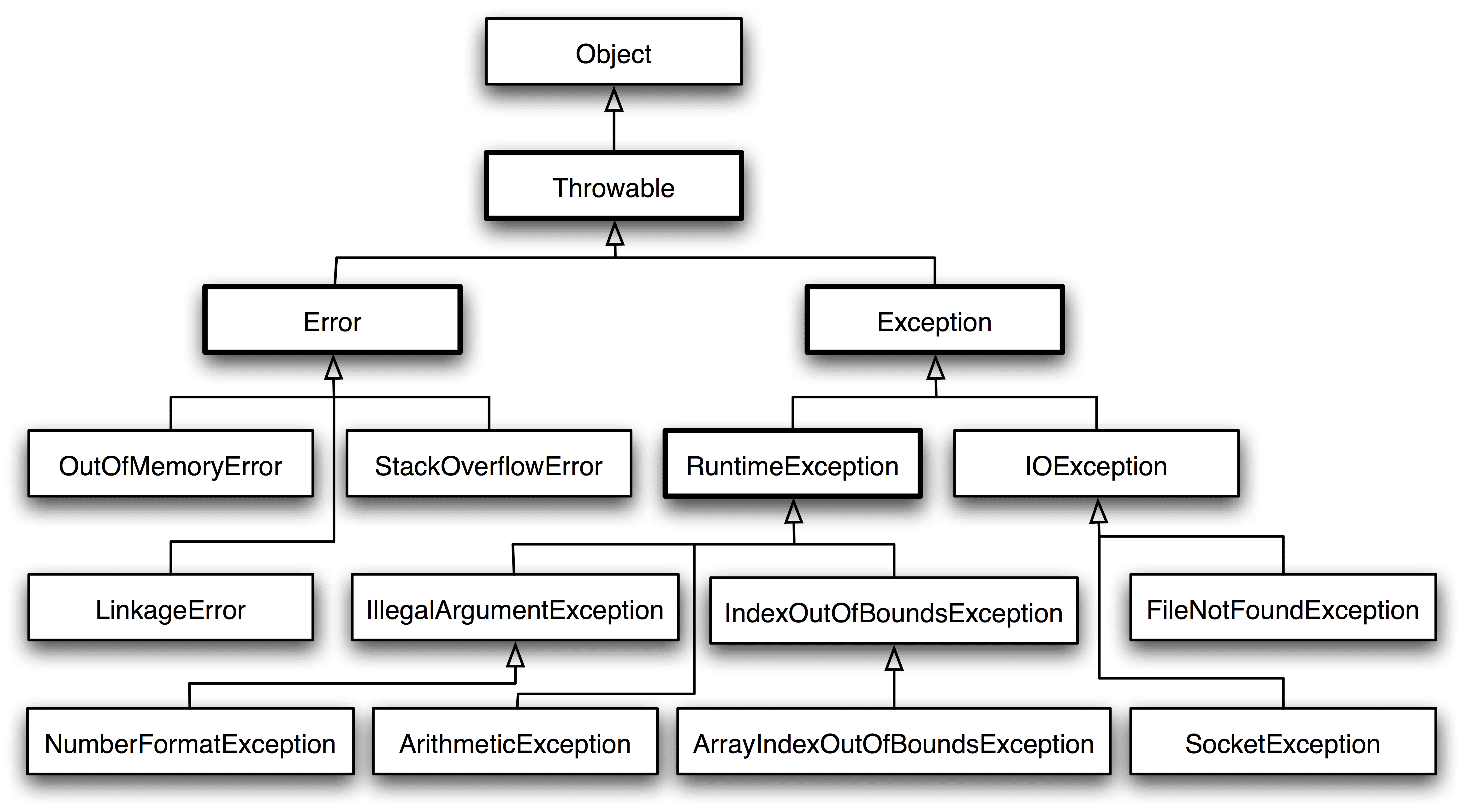 - 受检异常 : 需要用 try...catch... 语句捕获并进行处理,并且可以从异常中恢复;