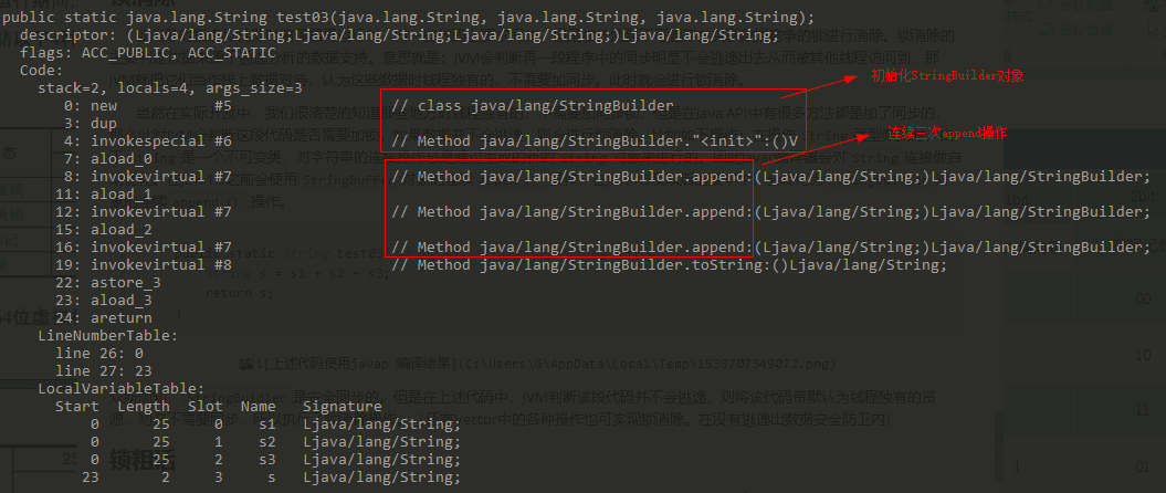 }在上述的连续append()操作中就属于这类情况。JVM会检测到这样一连串的操作都是对同一个对象加锁,那么JVM会将加锁同步的范围扩展(粗化)到整个一系列操作的 外部,使整个一连串的append()操作只需要加锁一次就可以了。