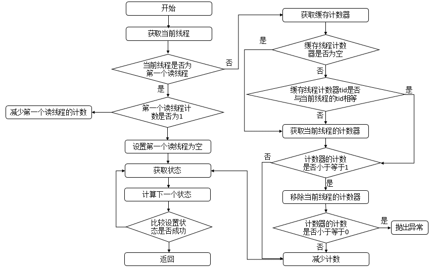 }说明: 此函数用于释放写锁资源,首先会判断该线程是否为独占线程,若不为独占线程,则抛出异常,否则,计算释放资源后的写锁的数量,若为0,表示成功释放,资源不将被占用,否则,表示资源还被占用。其函数流程图如下。