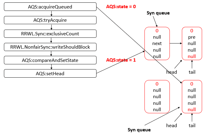 - wt1线程执行rrwLock.writeLock().lock操作,主要的函数调用如下。