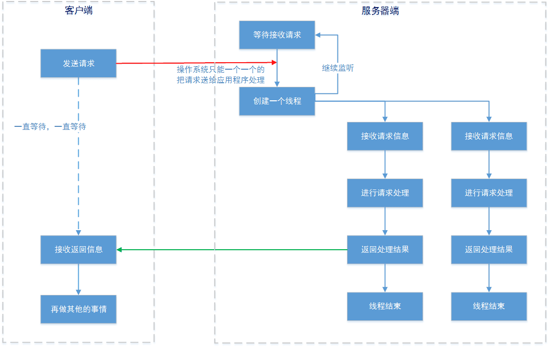 - 服务器端同样的,当在处理某个客户端A发来的请求时,另一个客户端B发来的请求会等待,直到服务器端的这个处理线程完成上一个处理。