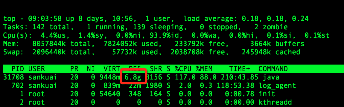 为了更好地实现对项目的管理,我们将组内一个项目迁移到MDP框架(基于Spring Boot),随后我们就发现系统会频繁报出Swap区域使用量过高的异常。笔者被叫去帮忙查看原因,发现配置了4G堆内内存,但是实际使用的物理内存竟然高达7G,确实不正常。JVM参数配置是“-XX:MetaspaceSize=256M -XX:MaxMetaspaceSize=256M -XX:+AlwaysPreTouch -XX:ReservedCodeCacheSize=128m -XX:InitialCodeCacheSize=128m, -Xss512k -Xmx4g -Xms4g,-XX:+UseG1GC -XX:G1HeapRegionSize=4M”,实际使用的物理内存如下图所示:
