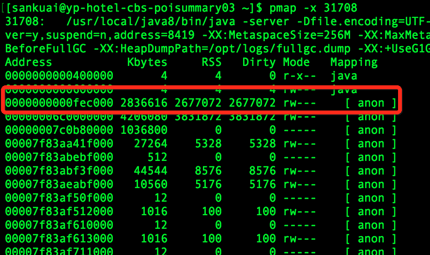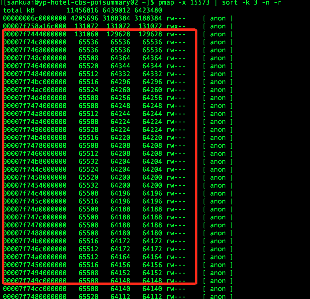 为了防止误判,笔者使用了pmap查看内存分布,发现大量的64M的地址;而这些地址空间不在jcmd命令所给出的地址空间里面,基本上就断定就是这些64M的内存所导致。