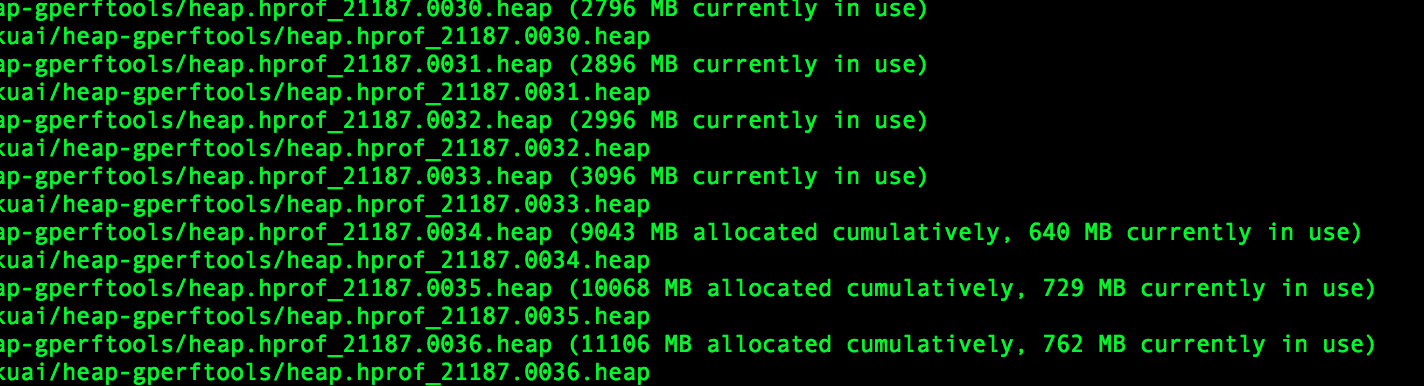 这时,再返过来看gperftools的内存分布情况,发现使用Spring Boot时,内存使用一直在增加,突然某个点内存使用下降了好多(使用量直接由3G降为700M左右)。这个点应该就是GC引起的,内存应该释放了,但是在操作系统层面并没有看到内存变化,那是不是没有释放到操作系统,被内存分配器持有了呢?