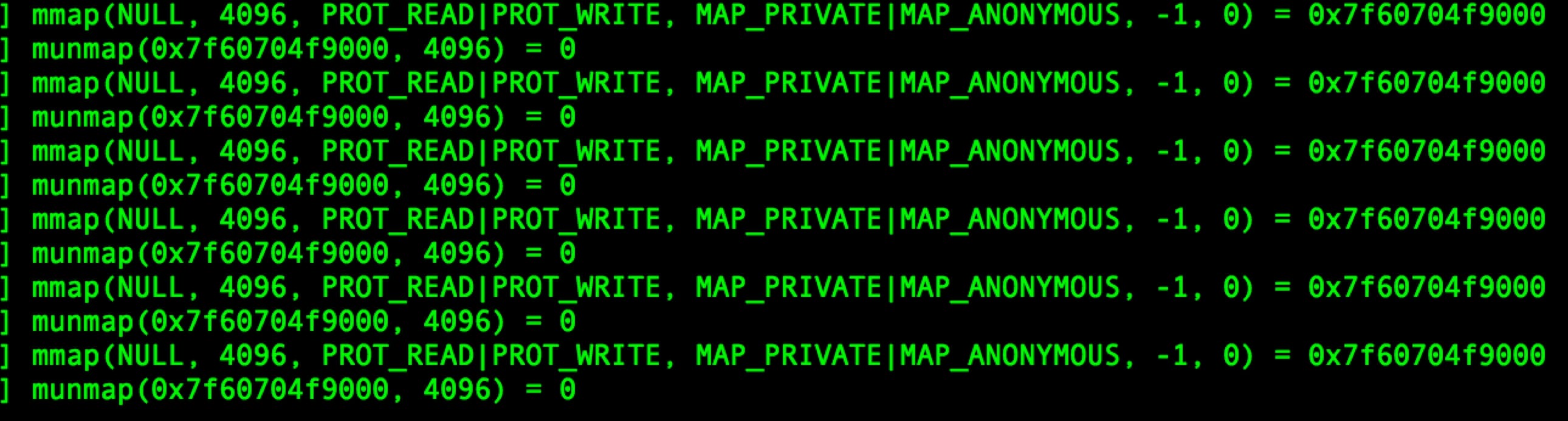 因为使用gperftools没有追踪到这些内存,于是直接使用命令“strace -f -e”brk,mmap,munmap” -p pid”追踪向OS申请内存请求,但是并没有发现有可疑内存申请。strace监控如下图所示: