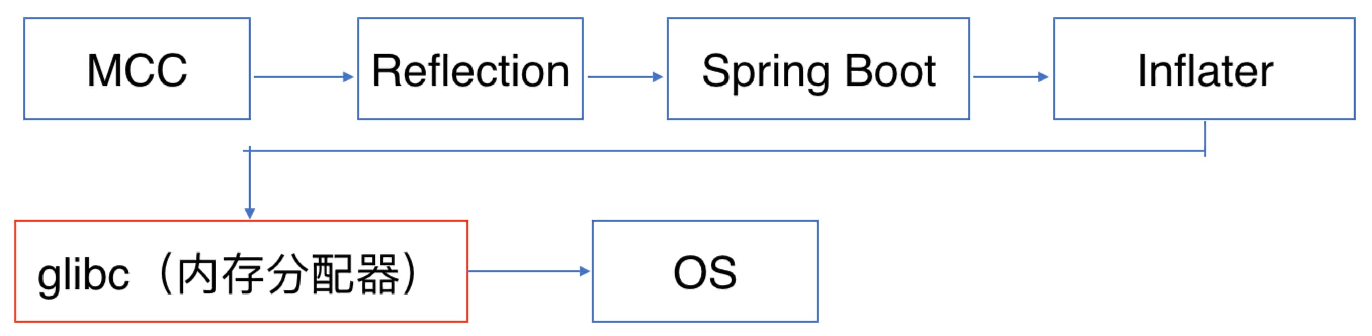 整个内存分配的流程如上图所示。MCC扫包的默认配置是扫描所有的JAR包。在扫描包的时候,Spring Boot不会主动去释放堆外内存,导致在扫描阶段,堆外内存占用量一直持续飙升。当发生GC的时候,Spring Boot依赖于finalize机制去释放了堆外内存;但是glibc为了性能考虑,并没有真正把内存归返到操作系统,而是留下来放入内存池了,导致应用层以为发生了“内存泄漏”。所以修改MCC的配置路径为特定的JAR包,问题解决。笔者在发表这篇文章时,发现Spring Boot的最新版本(2.0.5.RELEASE)已经做了修改,在ZipInflaterInputStream主动释放了堆外内存不再依赖GC;所以Spring Boot升级到最新版本,这个问题也可以得到解决。
