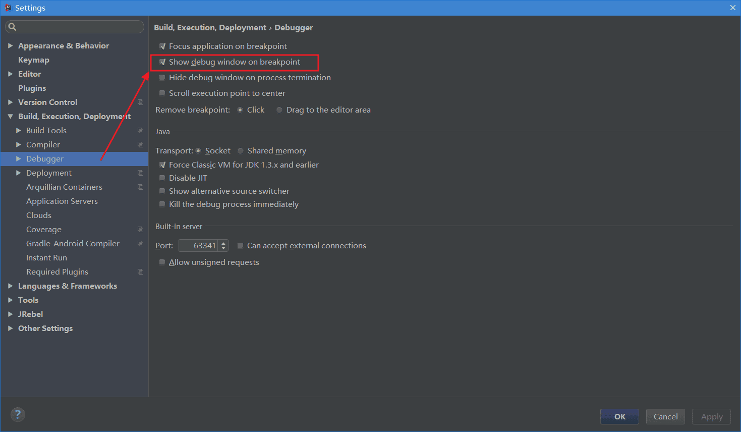 -Xdebug -Xrunjdwp:transport=dt_socket,suspend=n,server=y,address=${debug_port}其中的${debug_port}是用户自定义的,为debug端口,本例以5555端口为例。