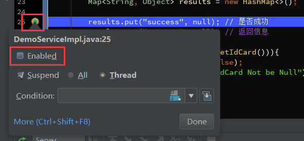 - Java Line Breakpoints 显示了所有的断点,在右边勾选Condition,设置断点的条件。