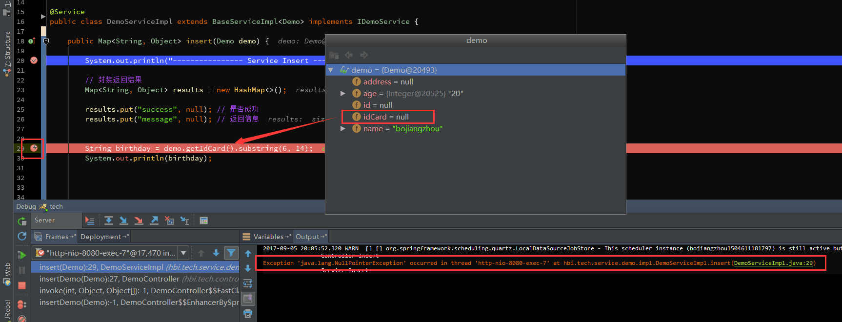 这里添加了一个NullPointerException异常断点,出现空指针异常后,自动定位在空指针异常行。