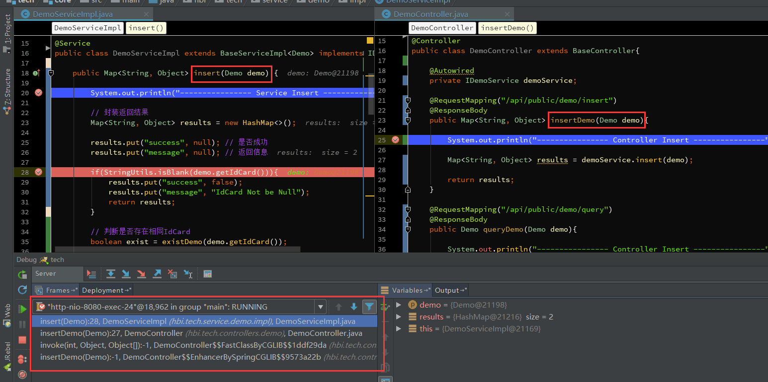 - 首先认识下这个方法调用栈,如图首先请求进入DemoController的insertDemo方法,然后调用insert方法,其它的invoke我们且先不管,最上面的方法是当前断点所在的方法。