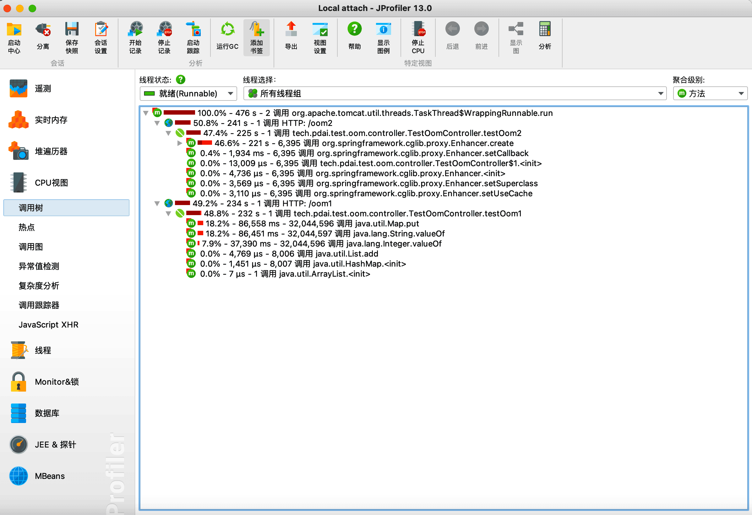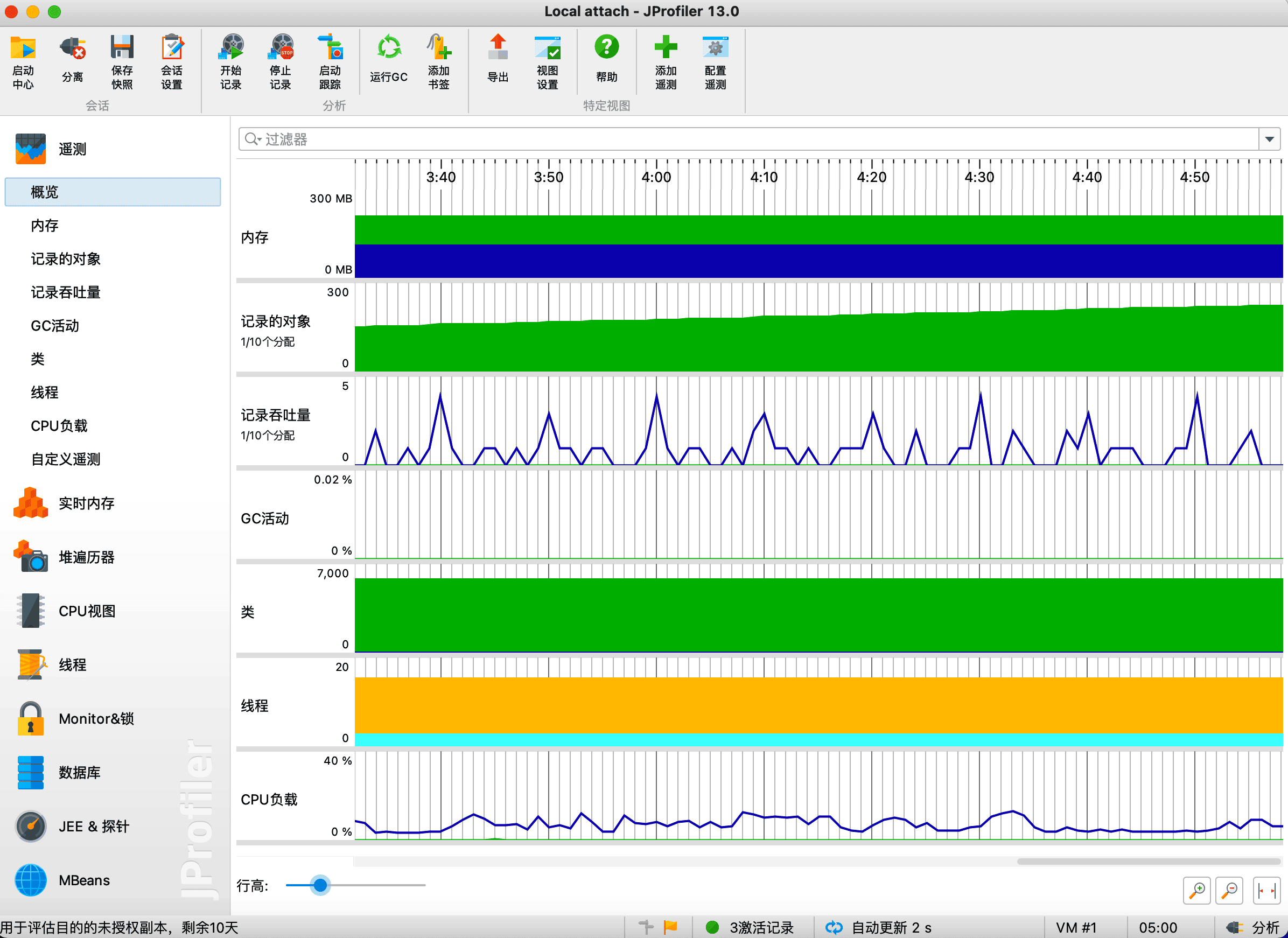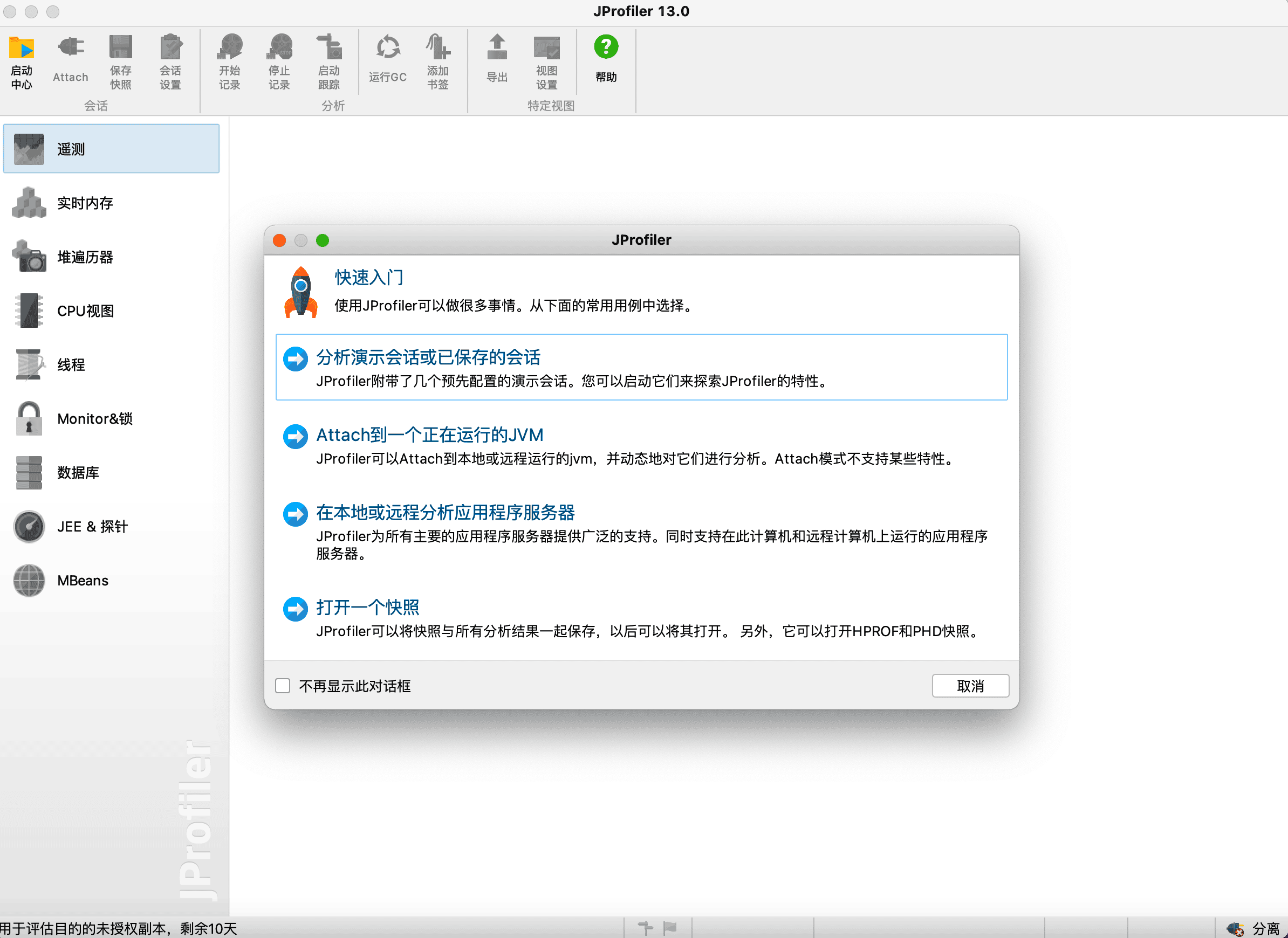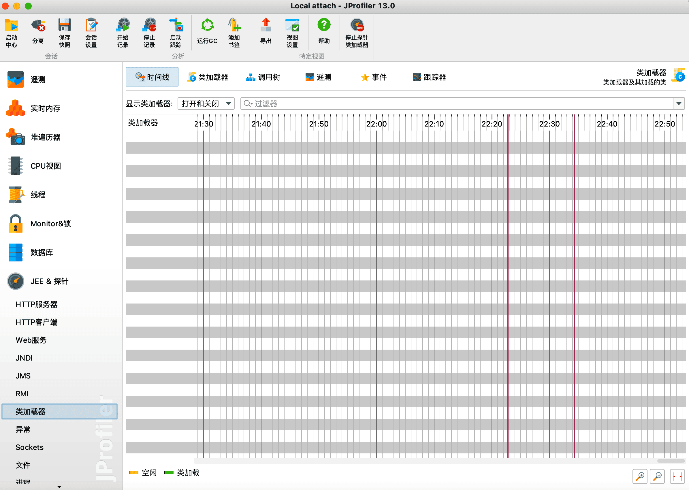JProfiler UI 的主要功能是展示通过 agent 采集上来的分析数据,此外还可以通过它控制 agent 的采集行为,将快照保存至磁盘,展示保存的快照。
