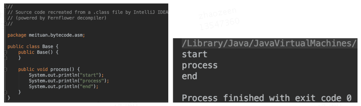 - 综上,重写MyMethodVisitor中的两个方法,就可以实现AOP了,而重写方法时就需要用ASM的写法,手动写入或者修改字节码。通过调用methodVisitor的visitXXXXInsn()方法就可以实现字节码的插入,XXXX对应相应的操作码助记符类型,比如mv.visitLdcInsn(“end”)对应的操作码就是ldc “end”,即将字符串“end”压入栈。 完成这两个visitor类后,运行Generator中的main方法完成对Base类的字节码增强,增强后的结果可以在编译后的target文件夹中找到Base.class文件进行查看,可以看到反编译后的代码已经改变了。然后写一个测试类MyTest,在其中new Base(),并调用base.process()方法,可以看到下图右侧所示的AOP实现效果: