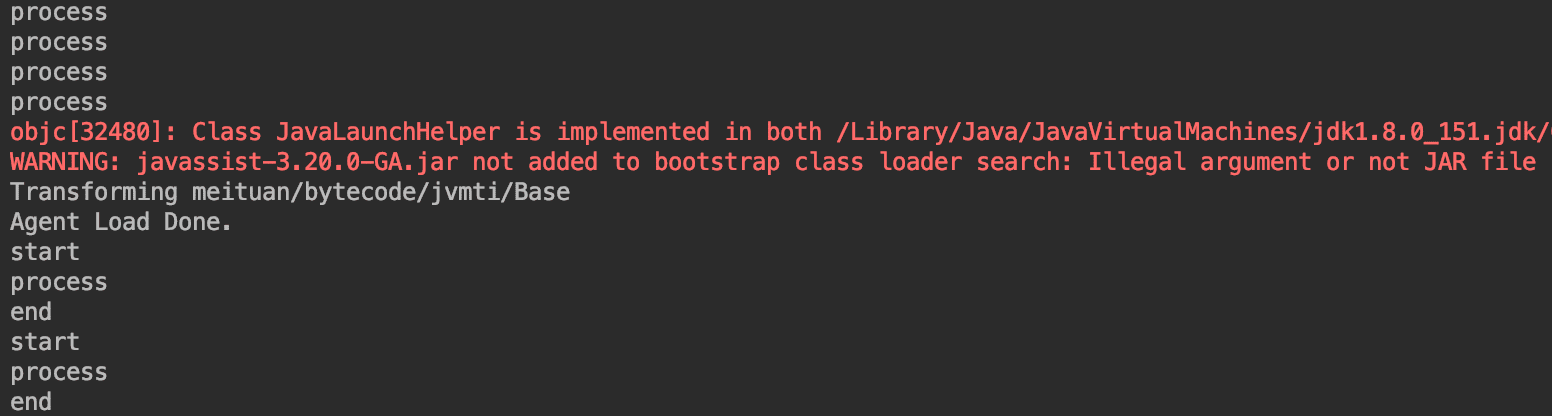 以下为运行时重新载入类的效果:先运行Base中的main()方法,启动一个JVM,可以在控制台看到每隔五秒输出一次”process”。接着执行Attacher中的main()方法,并将上一个JVM的pid传入。此时回到上一个main()方法的控制台,可以看到现在每隔五秒输出”process”前后会分别输出”start”和”end”,也就是说完成了运行时的字节码增强,并重新载入了这个类。