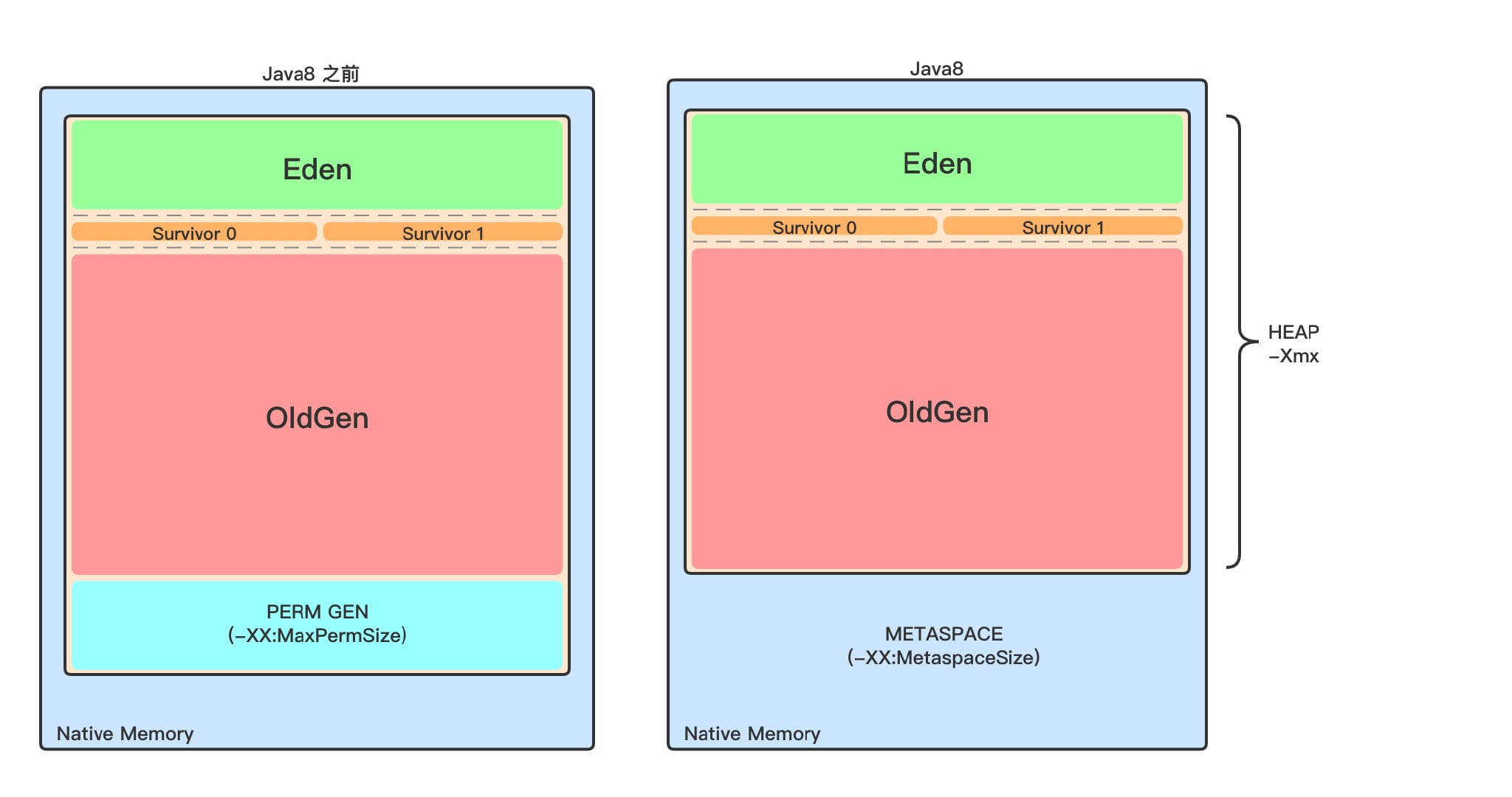-XX:PermSize和-xx:MaxPermSize来设置永久代参数,Java8 之后,随着永久代的取消,这些参数也就随之失效了,改为通过-XX:MetaspaceSize和-XX:MaxMetaspaceSize用来设置元空间参数 - 存储内容不同,元空间存储类的元信息,静态变量和常量池等并入堆中。相当于永久代的数据被分到了堆和元空间中