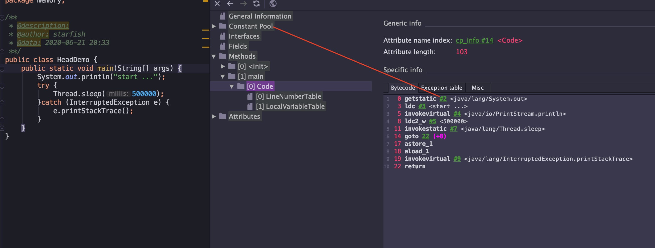 (分析:进入class文件所在目录,执行 javap -v xx.class 反解析(或者通过 IDEA 插件 Jclasslib 直接查看,上图),可以看到当前类对应的Code区(汇编指令)、本地变量表、异常表和代码行偏移量映射表、常量池等信息。)