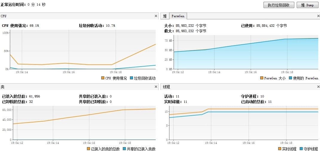 可以从上面的JVisualVM的截图看出: 当加载超过6万个类之后,PermGen被耗尽。我们也能通过程序和GC的输出观察耗尽的过程。
