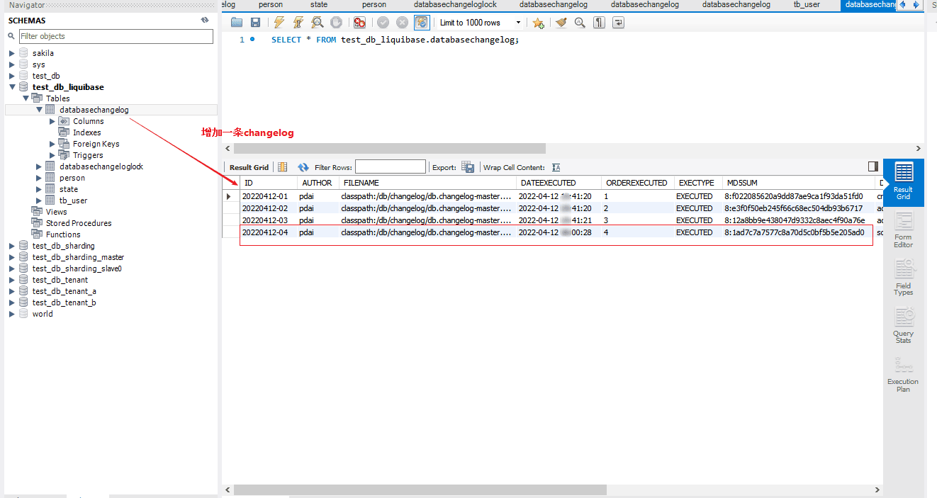 2022-04-12 21:00:28.532 INFO 17540 --- [ main] liquibase.lockservice : Successfully released change log lock执行后,查看变更记录