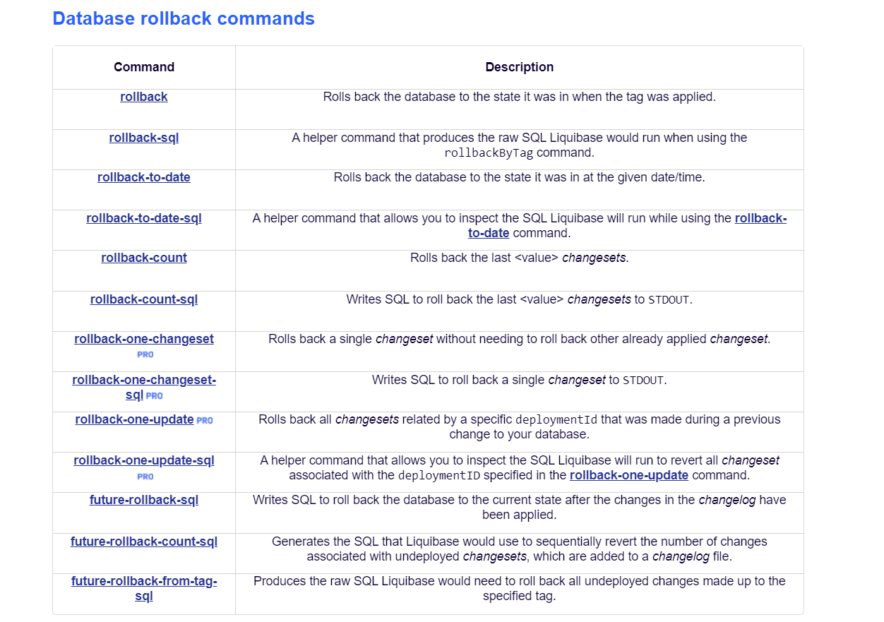 - 提供变化应用的回滚功能,可按时间、数量或标签(tag)回滚已应用的变化。通过这种方式,开发人员可轻易的还原数据库在任何时间点的状态