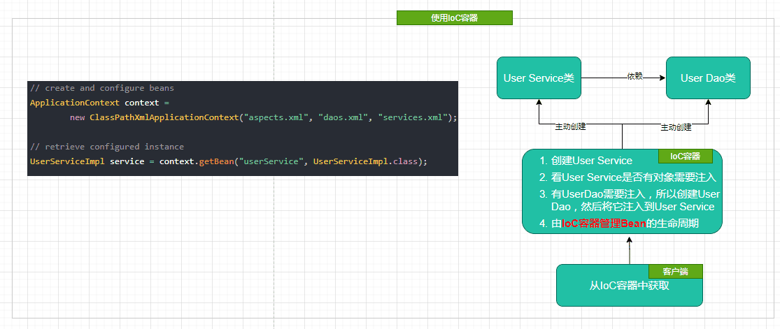 其实IoC对编程带来的最大改变不是从代码上,而是从思想上,发生了“主从换位”的变化。应用程序原本是老大,要获取什么资源都是主动出击,但是在IoC/DI思想中,应用程序就变成被动的了,被动的等待IoC容器来创建并注入它所需要的资源了。