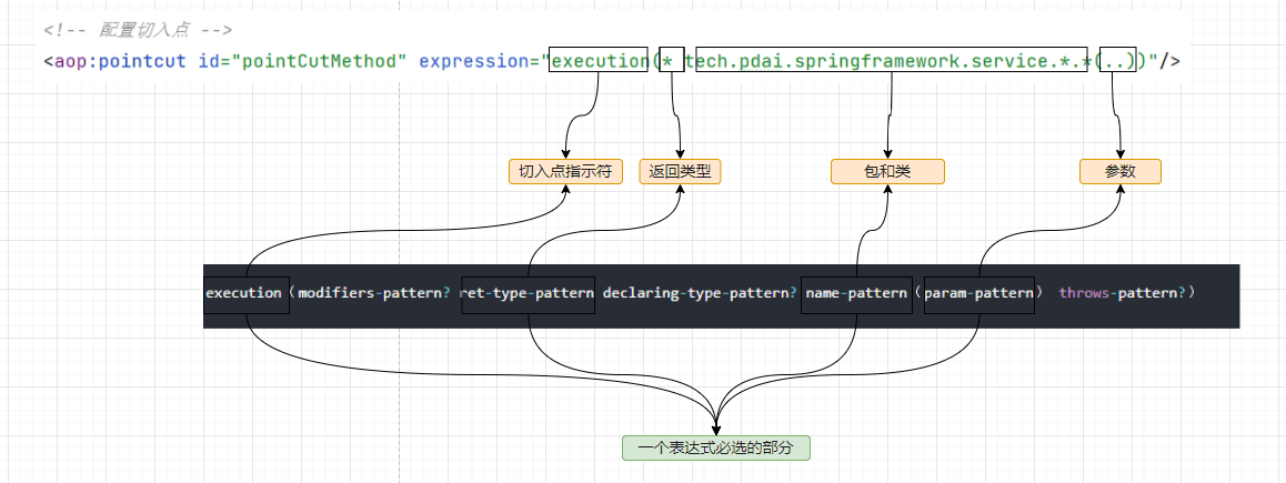 execution(modifiers-pattern? ret-type-pattern declaring-type-pattern? name-pattern(param-pattern) throws-pattern?)- ret-type-pattern 返回类型模式, name-pattern名字模式和param-pattern参数模式是必选的, 其它部分都是可选的。返回类型模式决定了方法的返回类型必须依次匹配一个连接点。 你会使用的最频繁的返回类型模式是