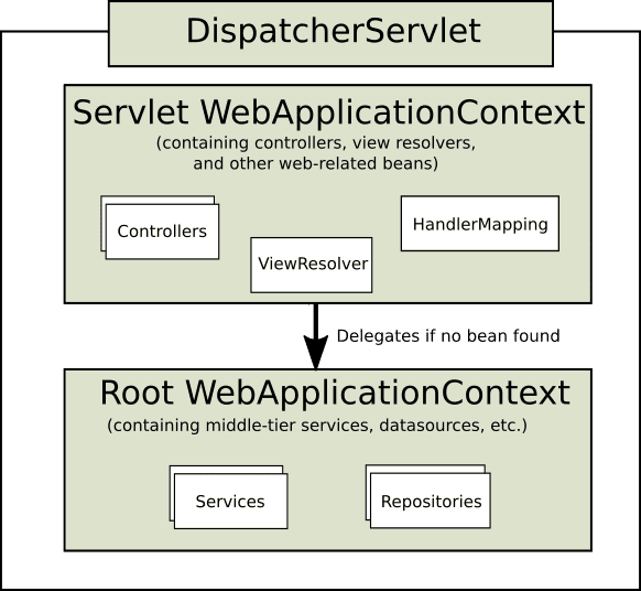 Root WebApplicationContext 包含需要共享给多个 Servlet 实例的数据源和业务服务基础 Bean。这些 Bean 可以在 Servlet 特定的范围被继承或覆盖。