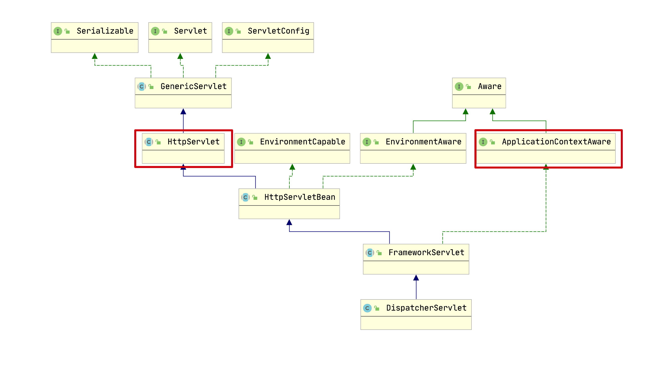 首先我们看DispatcherServlet的类结构关系,在这个类依赖结构中找到init的方法