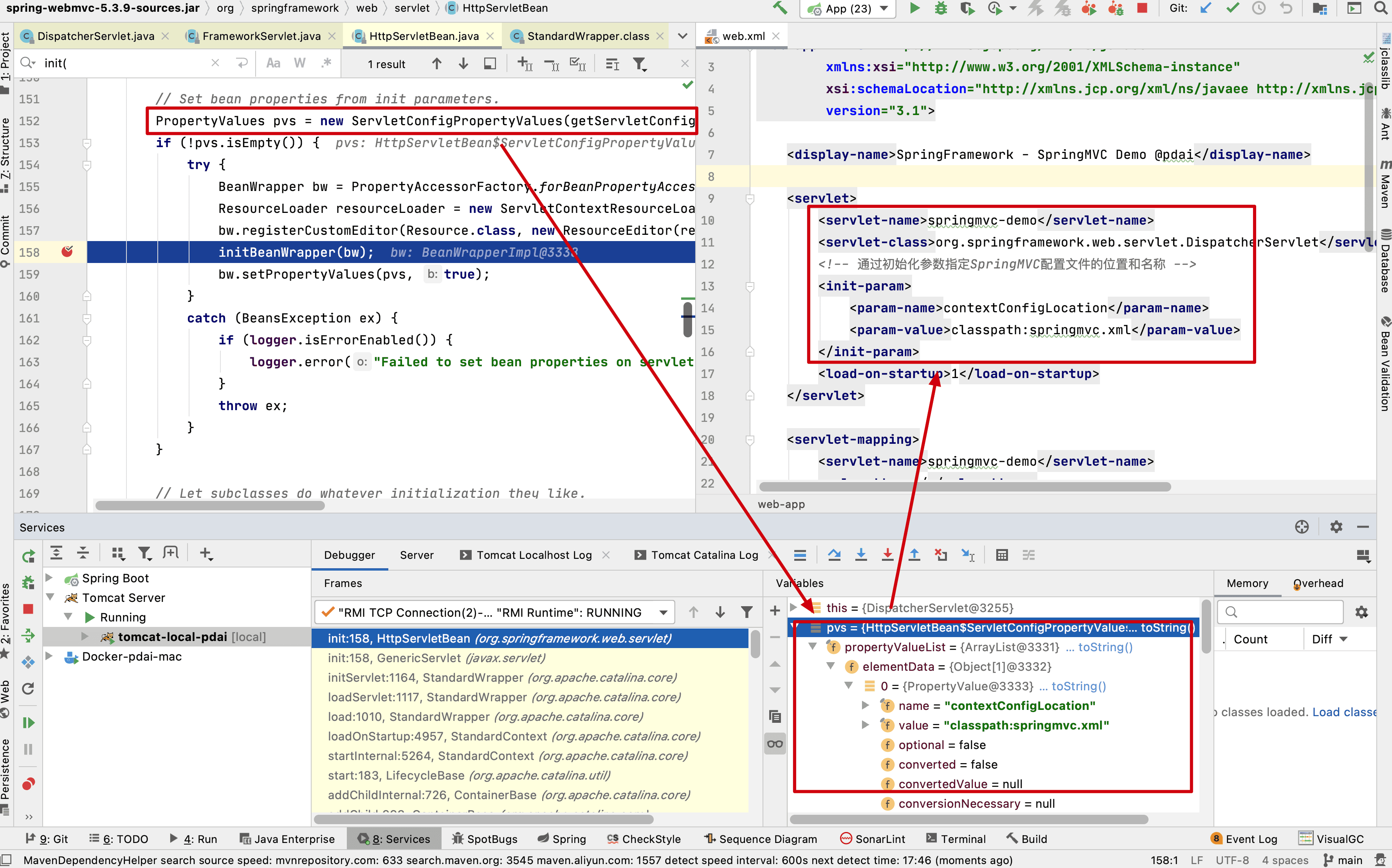 很容易找到init()的方法位于HttpServletBean中,然后跑Spring基础 - SpringMVC请求流程和案例中的代码,在init方法中打断点。
