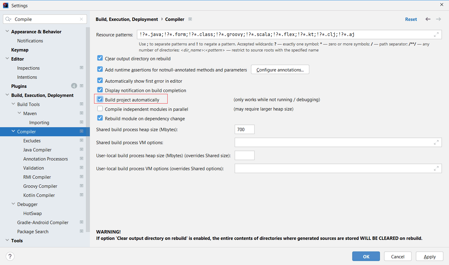 File->Setting->Build,Execution,Deployment->Compile