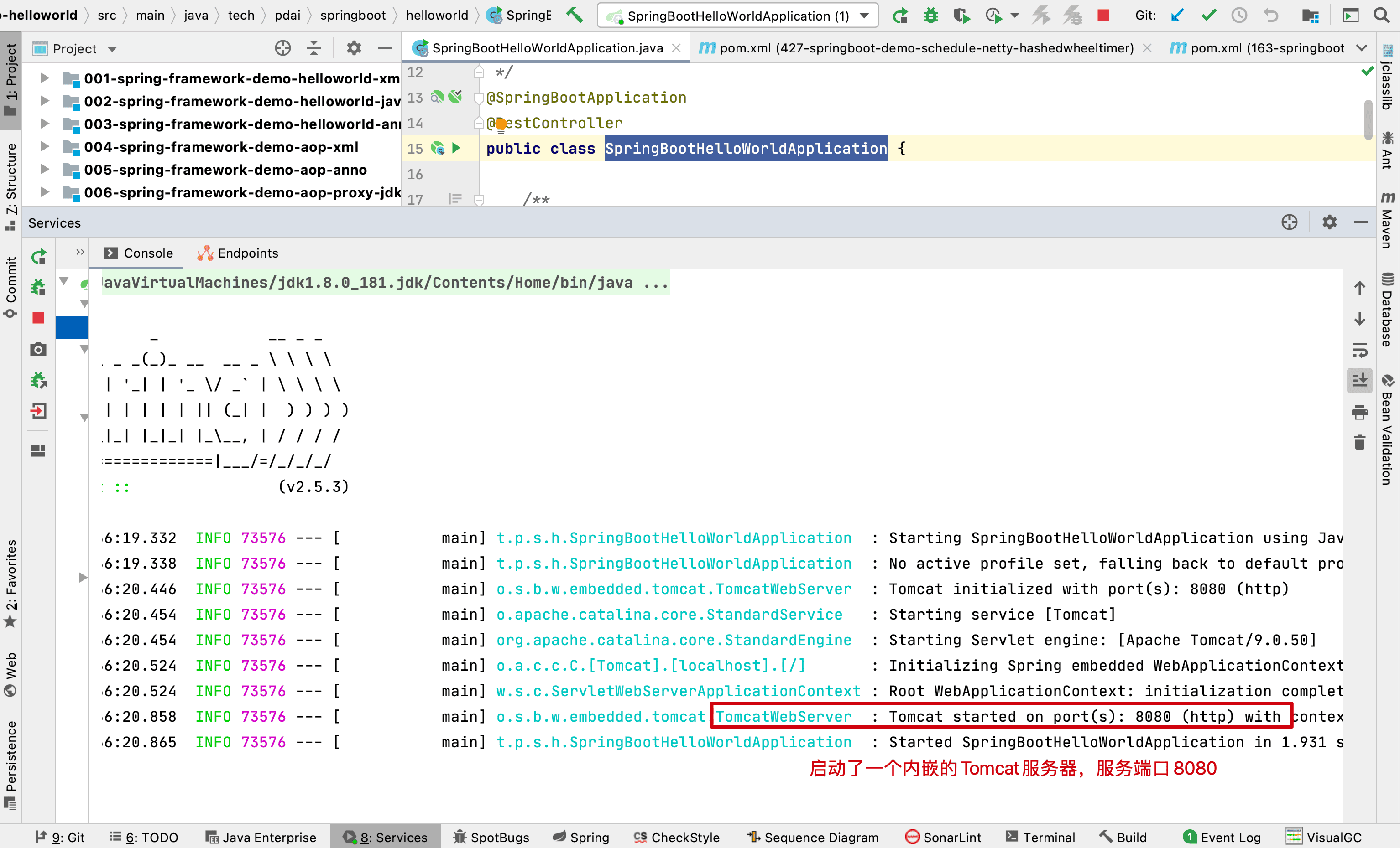 运行后,你将看到如下的信息:表明我们启动程序成功(启动了一个内嵌的Tomcat容器,服务端口在8080)