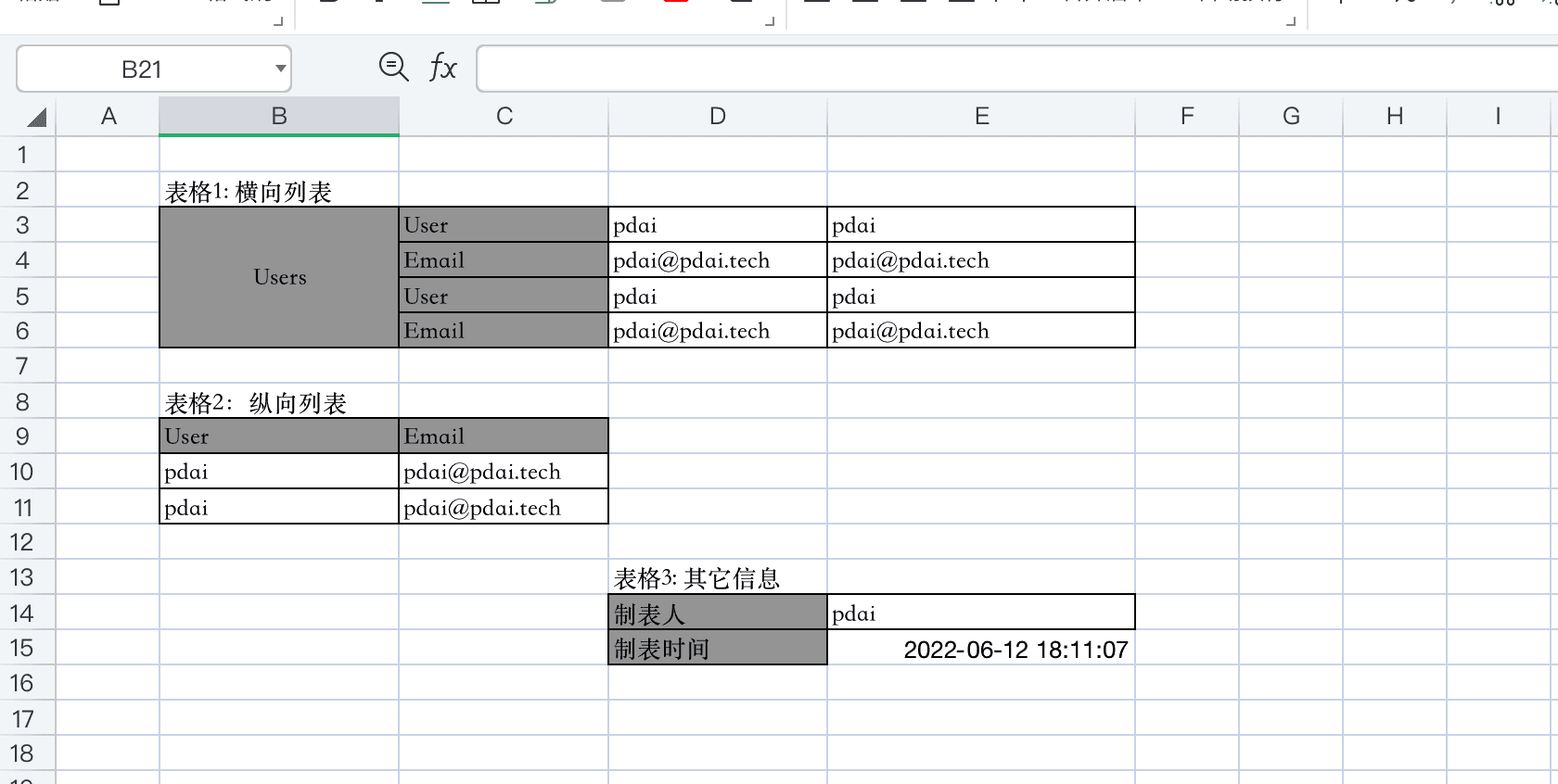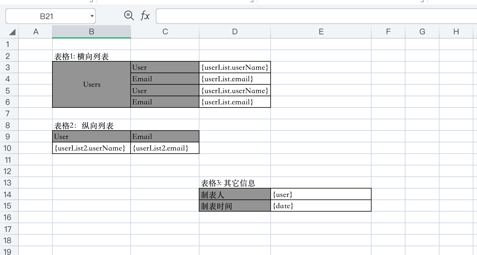 我们先来准备一个excel模板,考虑了横向表和纵向列表,以及单一信息等,基本上能满足多数的应用场景。
