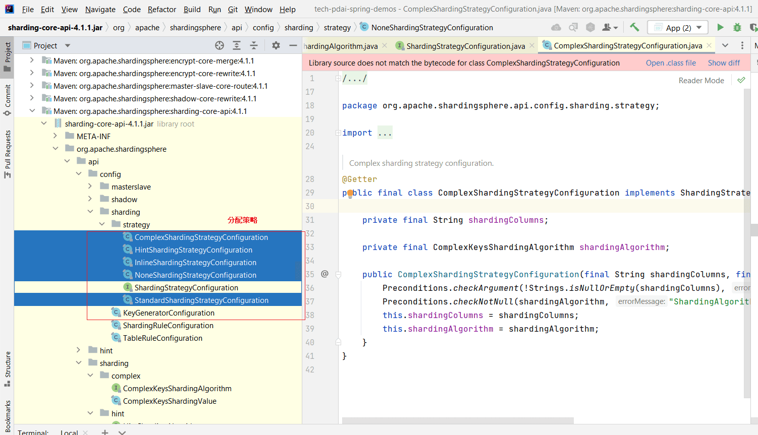对应ComplexKeysShardingAlgorithm,用于处理使用多键作为分片键进行分片的场景,包含多个分片键的逻辑较复杂,需要应用开发者自行处理其中的复杂度。需要配合ComplexShardingStrategy使用。