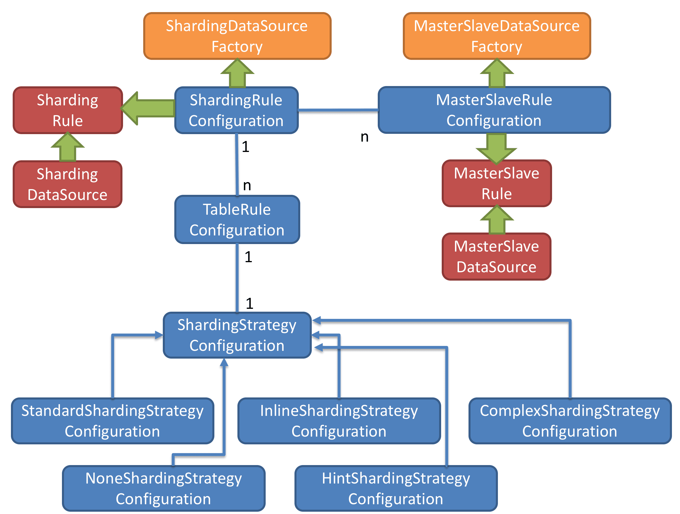图中蓝色部分表示的是Sharding-JDBC的配置对象,提供灵活多变的配置方式。 ShardingRuleConfiguration是分库分表配置的核心和入口,它可以包含多个TableRuleConfiguration和MasterSlaveRuleConfiguration。每一组相同规则分片的表配置一个TableRuleConfiguration。如果需要分库分表和读写分离共同使用,每一个读写分离的逻辑库配置一个MasterSlaveRuleConfiguration。 每个TableRuleConfiguration对应一个ShardingStrategyConfiguration,它有5中实现类可供选择。