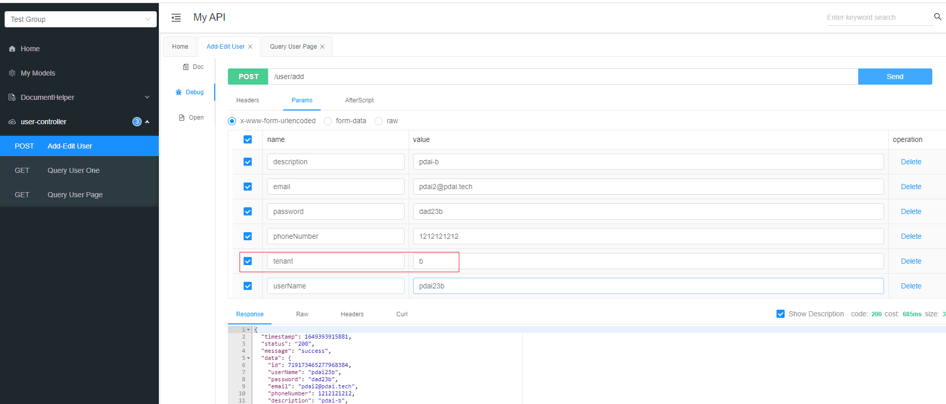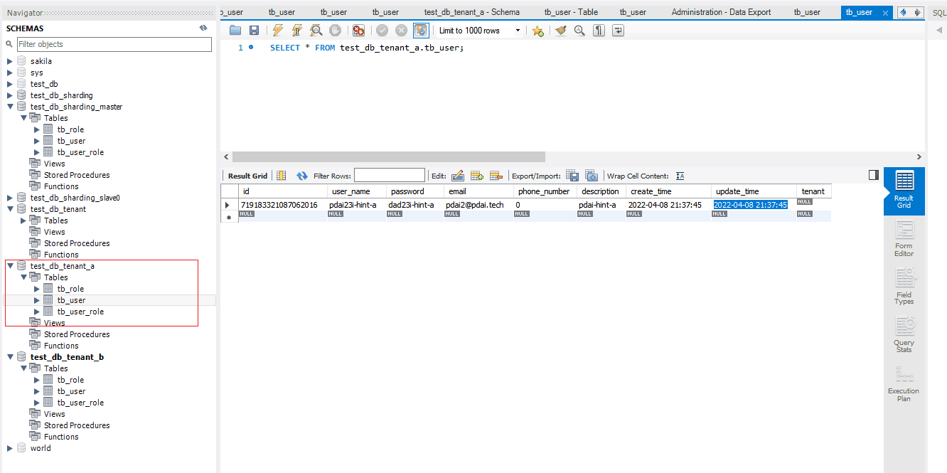 2022-04-08 21:38:49.473 INFO 13136 --- [nio-8080-exec-1] ShardingSphere-SQL : Actual SQL: tenant-a ::: insert into tb_user (create_time, description, email, password, phone_number, update_time, user_name, id) values (?, ?, ?, ?, ?, ?, ?, ?) ::: [2022-04-08 21:37:45.061, pdai-hint-a, pdai2@pdai.tech, dad23i-hint-a, 0, 2022-04-08 21:37:45.061, pdai23i-hint-a, 719183321087062016]