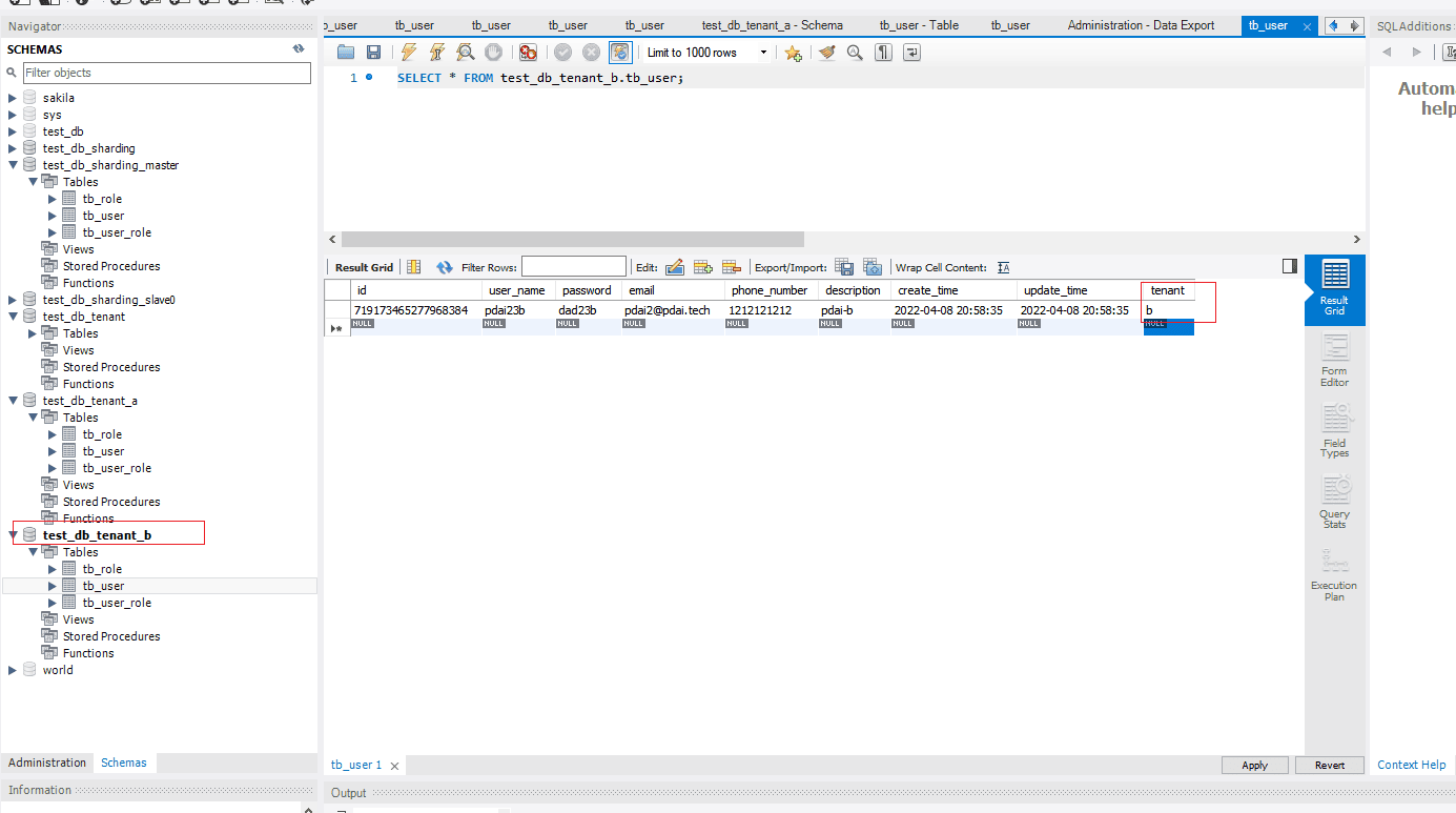 2022-04-08 21:03:33.877 INFO 8256 --- [nio-8080-exec-2] ShardingSphere-SQL : Actual SQL: tenant-b ::: select user0_.id as id1_1_, user0_.create_time as create_t2_1_, user0_.description as descript3_1_, user0_.email as email4_1_, user0_.password as password5_1_, user0_.phone_number as phone_nu6_1_, user0_.tenant as tenant7_1_, user0_.update_time as update_t8_1_, user0_.user_name as user_nam9_1_ from tb_user user0_ where user0_.tenant=? limit ? ::: [b, 10]